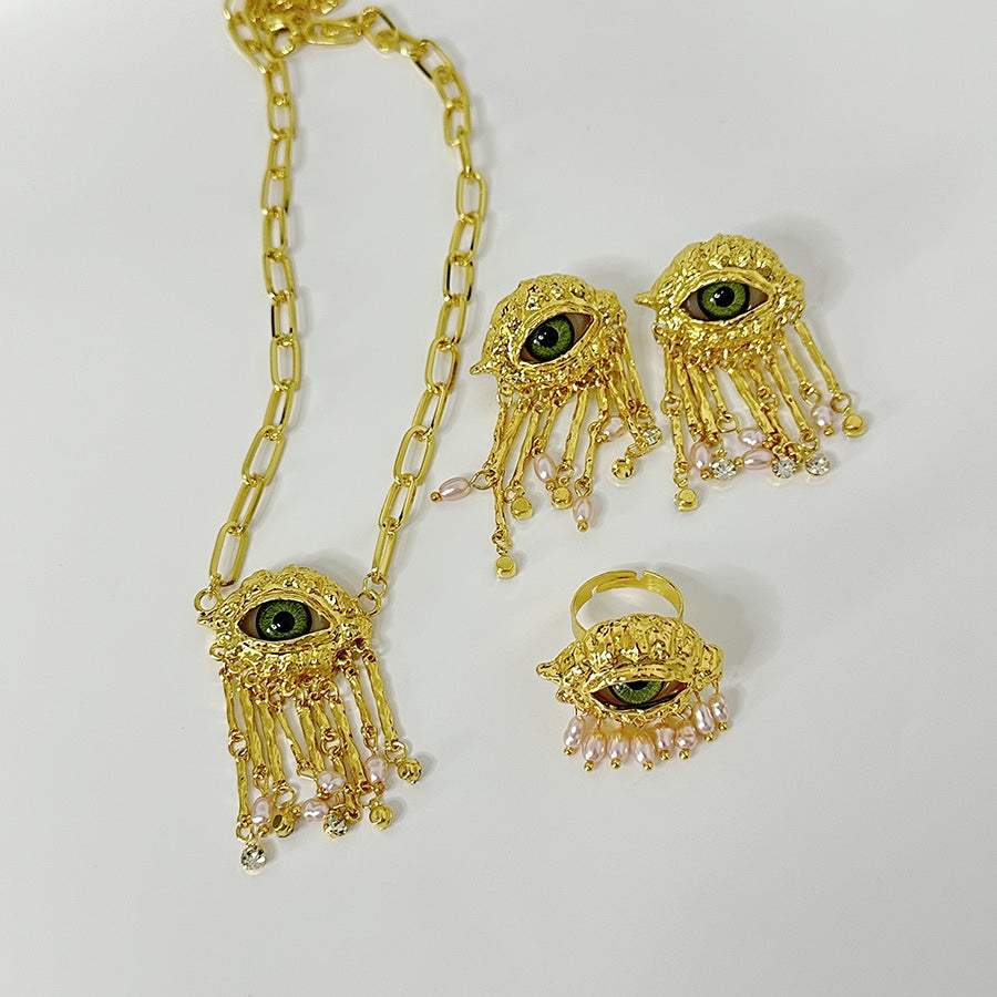 Parure féminine au design unique comprenant collier, boucles d’oreilles, bague et bracelet. Détails œil du démon et perles élégantes pour un look mystérieux et raffiné à la fois. Parfaite pour celles qui aiment un style audacieux et sophistiqué.
