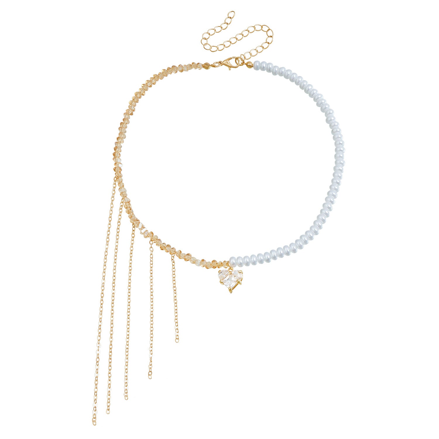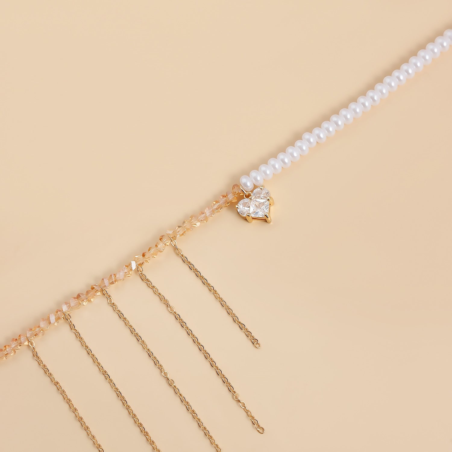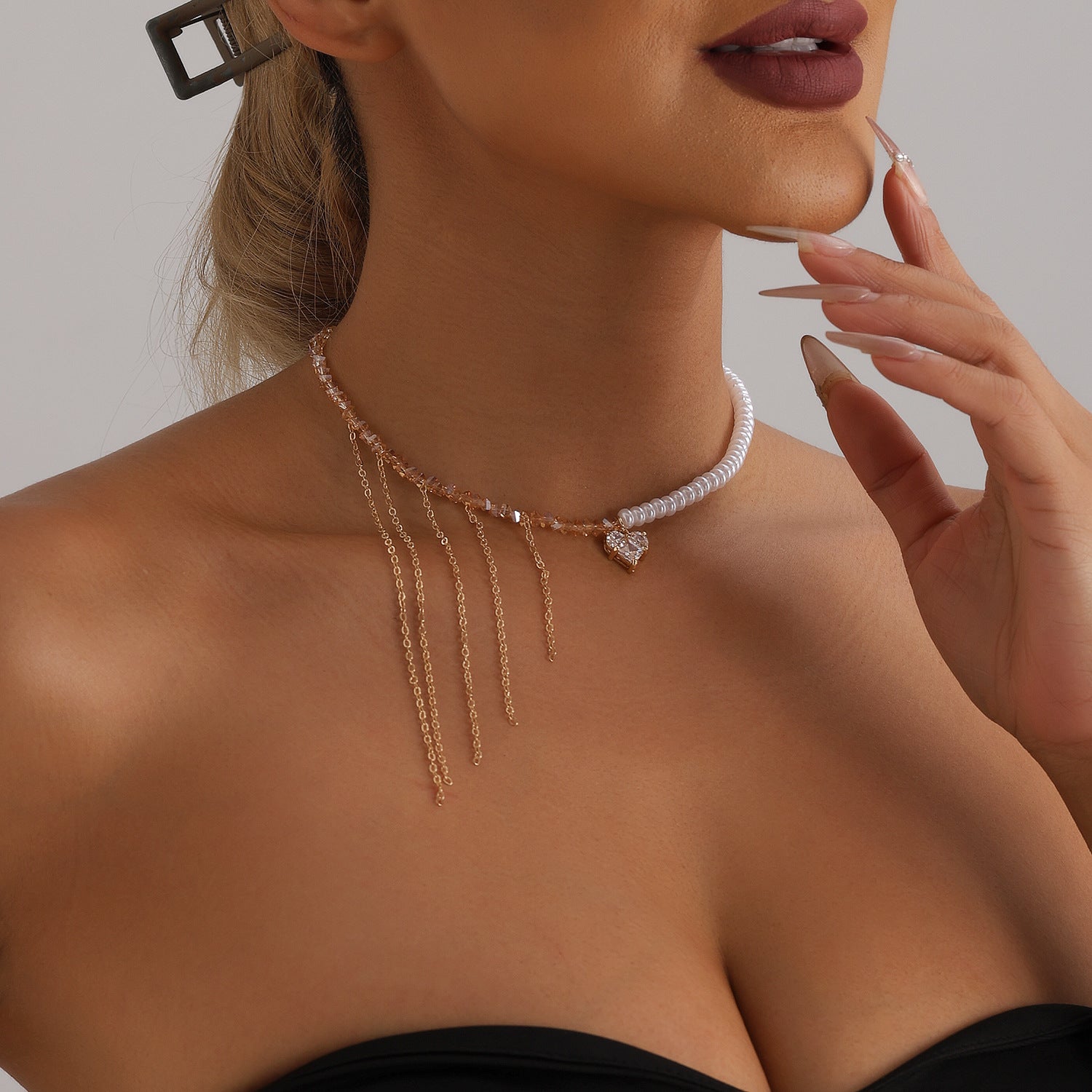 Collier délicat combinant un pendentif cœur serti de zircon, des perles et des cristaux étincelants, agrémenté de fines pampilles. Son design sophistiqué et féminin reflète une élégance moderne d’inspiration européenne. Parfait pour ajouter une touche lumineuse et chic à vos tenues de soirée ou de tous les jours.