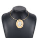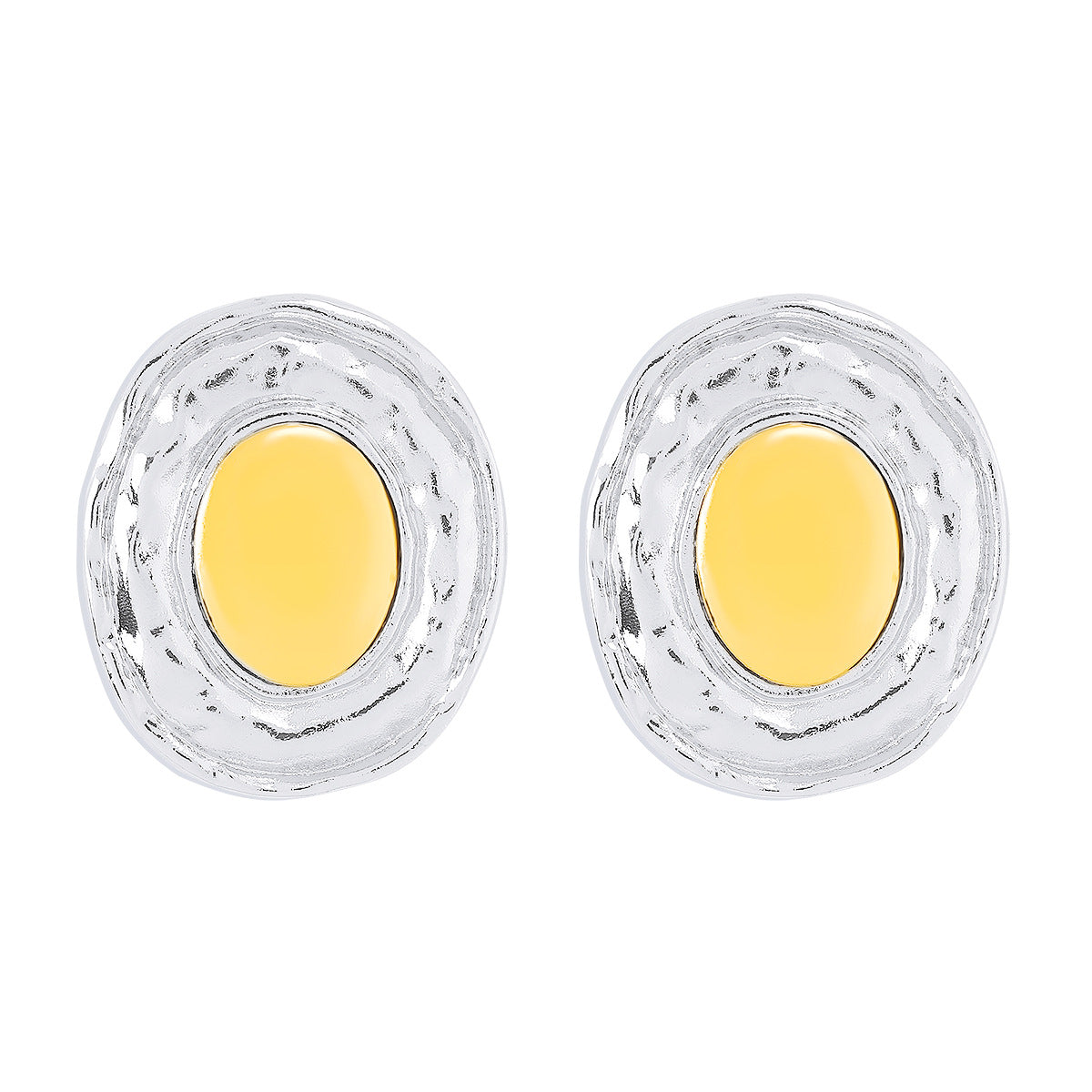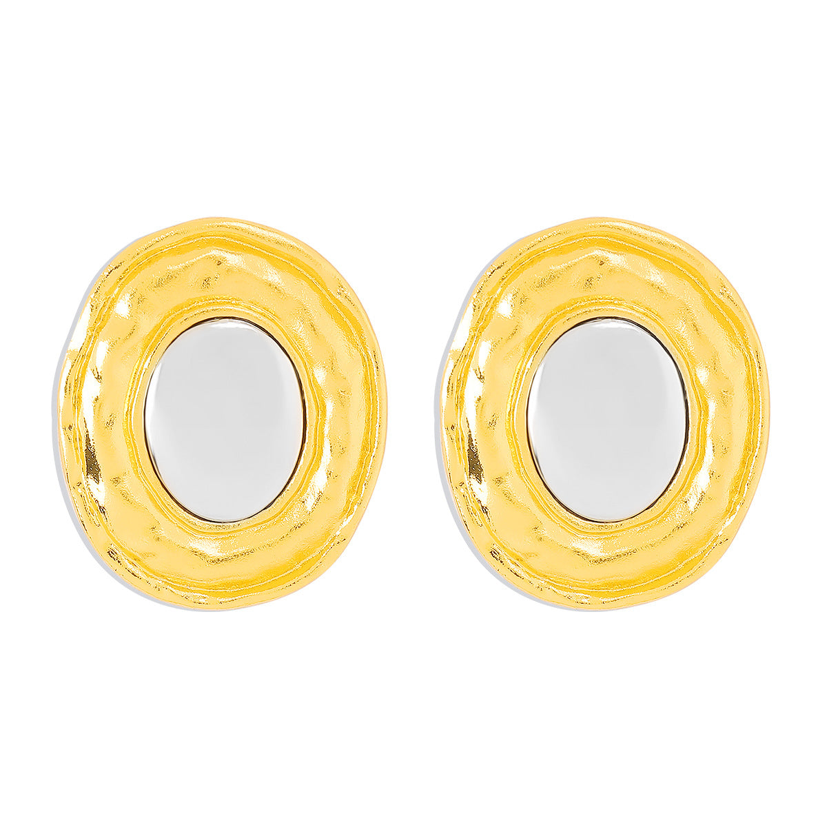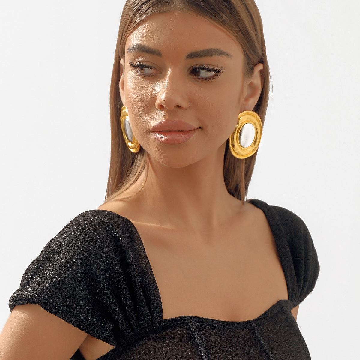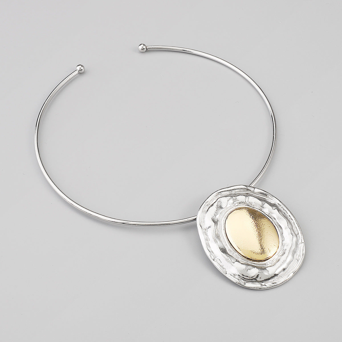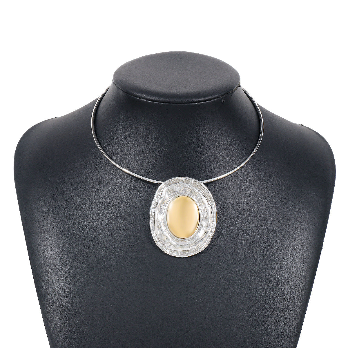 Ensemble élégant composé d’un collier et de boucles d’oreilles en métal poli effet miroir. Design ovale bicolore, moderne et raffiné pour sublimer toutes vos tenues.