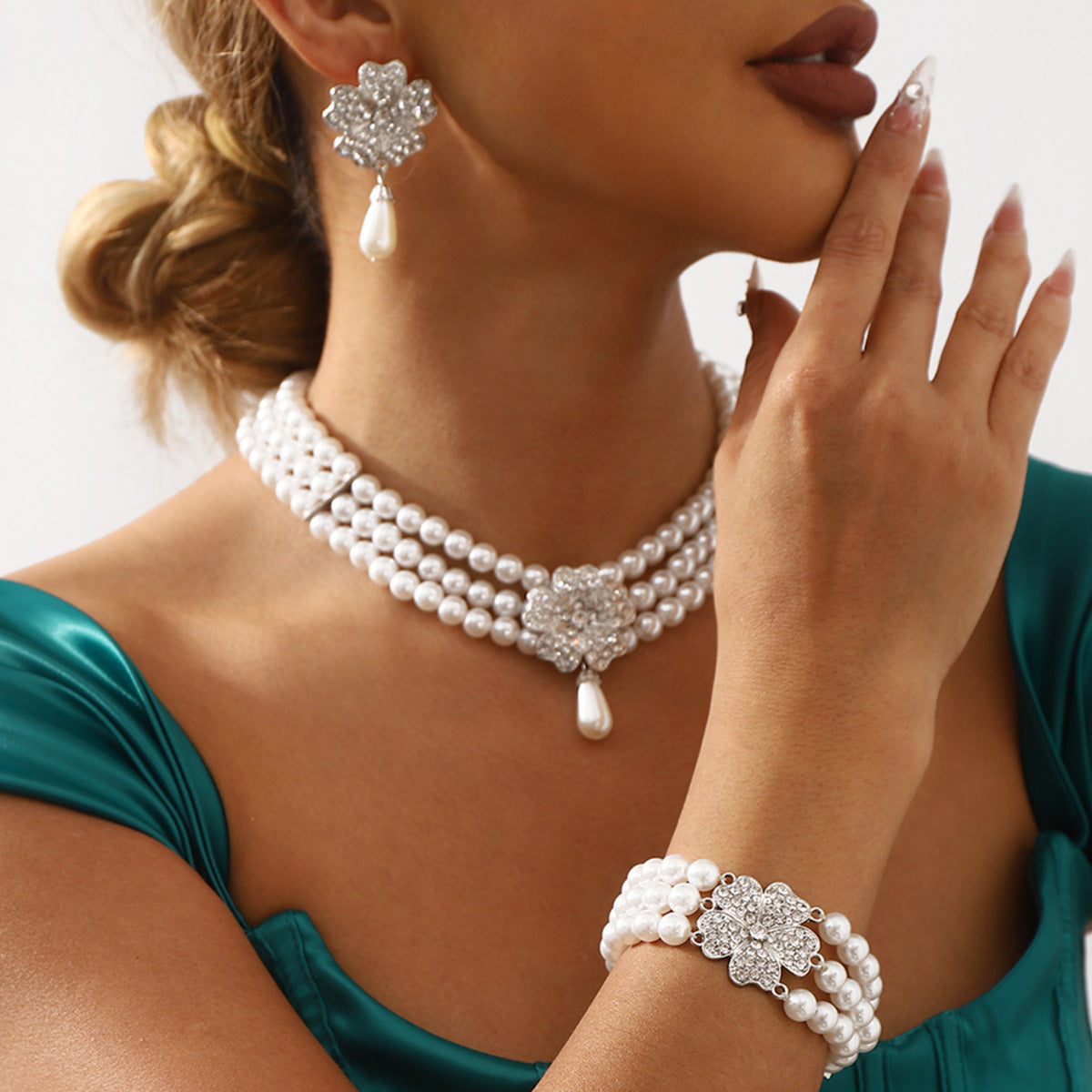 Sublimez votre jour spécial avec cette parure raffinée composée d’un collier, de boucles d’oreilles et d’un bracelet ornés de fleurs incrustées de strass et de perles blanches. Inspiré du style français, cet ensemble allie douceur, éclat et féminité pour une allure de mariée gracieuse et lumineuse.
